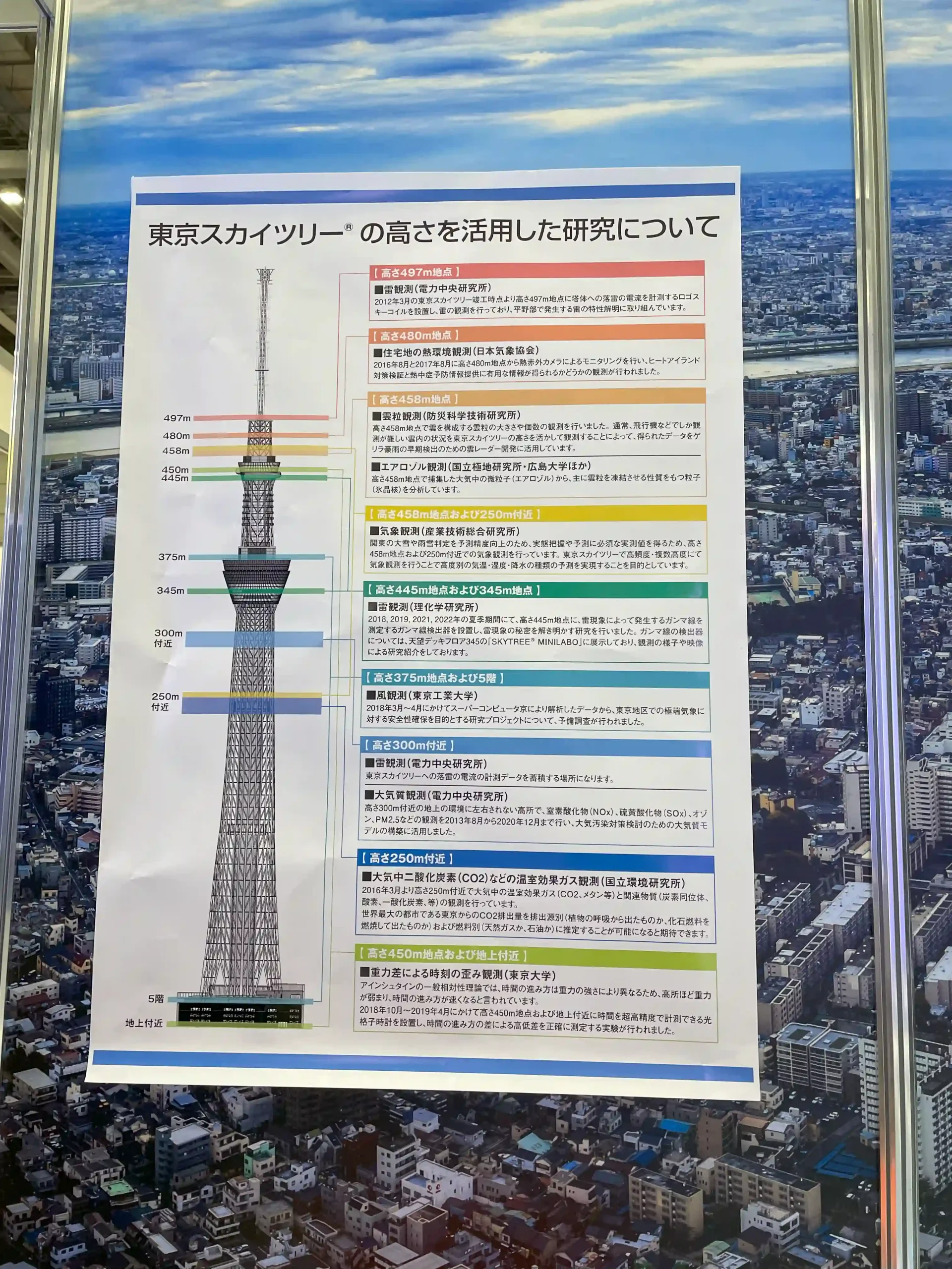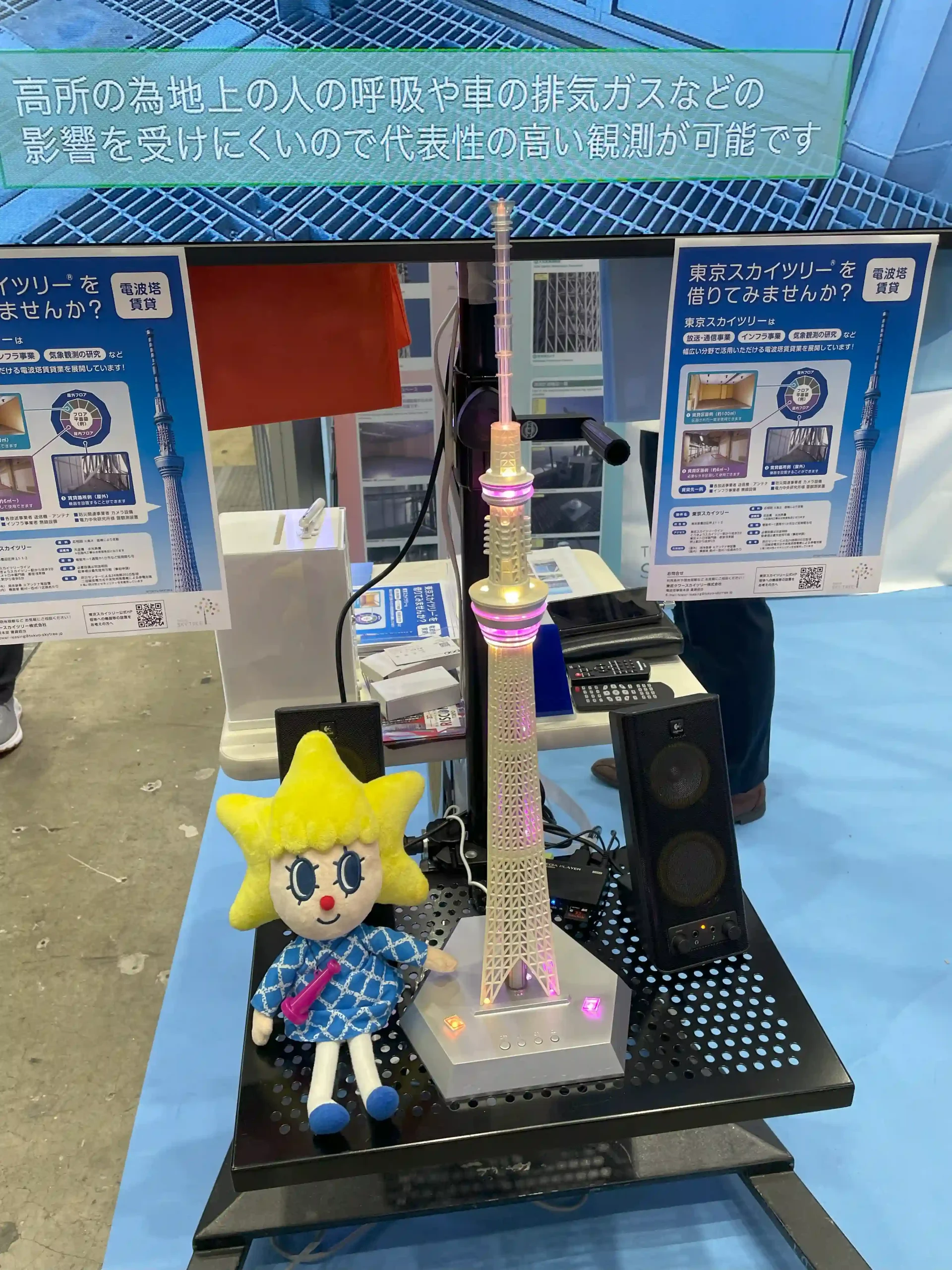 東京スカイツリーは電波塔の屋内外に、さまざまな研究機器等を設置するスペースを設けている。今回はその場所貸しを提案するために出展。年に10回ほど落雷があるということから、雷の観測に関する機器なども設置されているという。