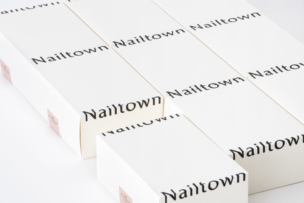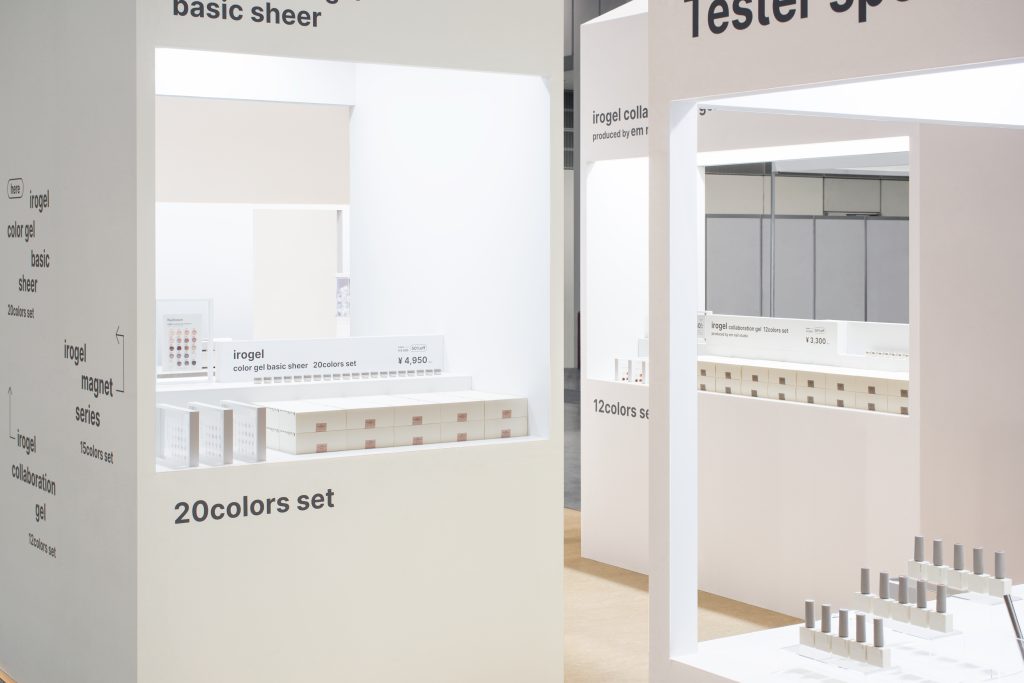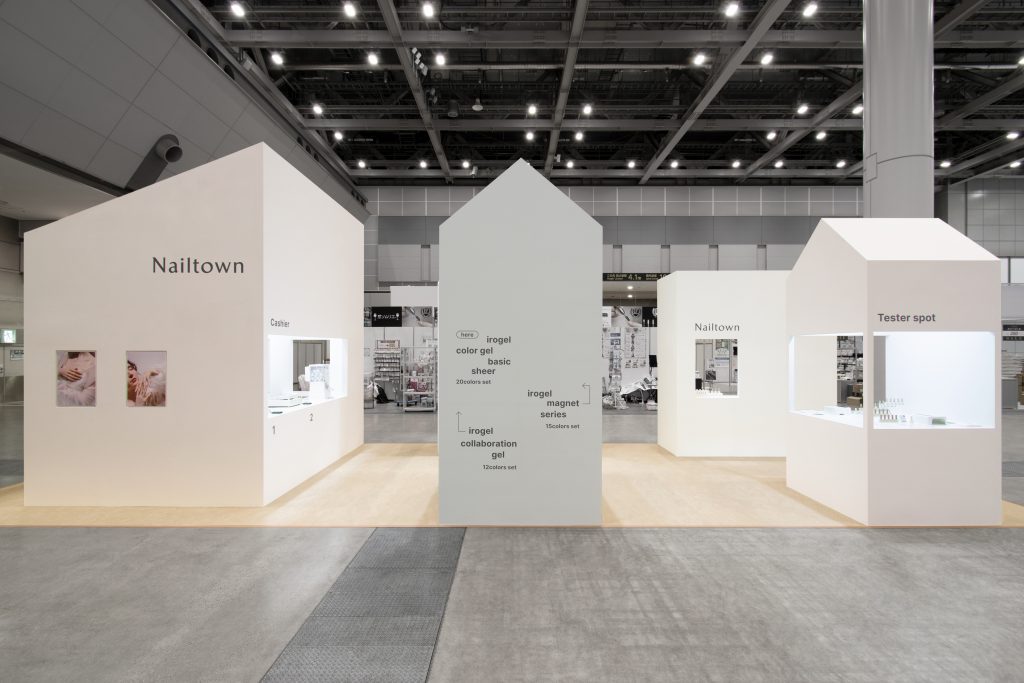小栗 当時はブランドリニューアルのタイミングで、新しい世界観を伝えることが重要でした。普段はオンライン販売のみで実店舗を持たないブランドである「Nailtown」が、もしリアルな場に現れたらどうなるか。展示スペースに小さな家をたくさん建て、名前の通り、ネイルの街を具現化しました。ただ、街中を歩くときと同様に「どこで何が見られるか」を示す標識が必要です。グラフィックを活用し、テスタースポットや各商品の展示場所を示しました。