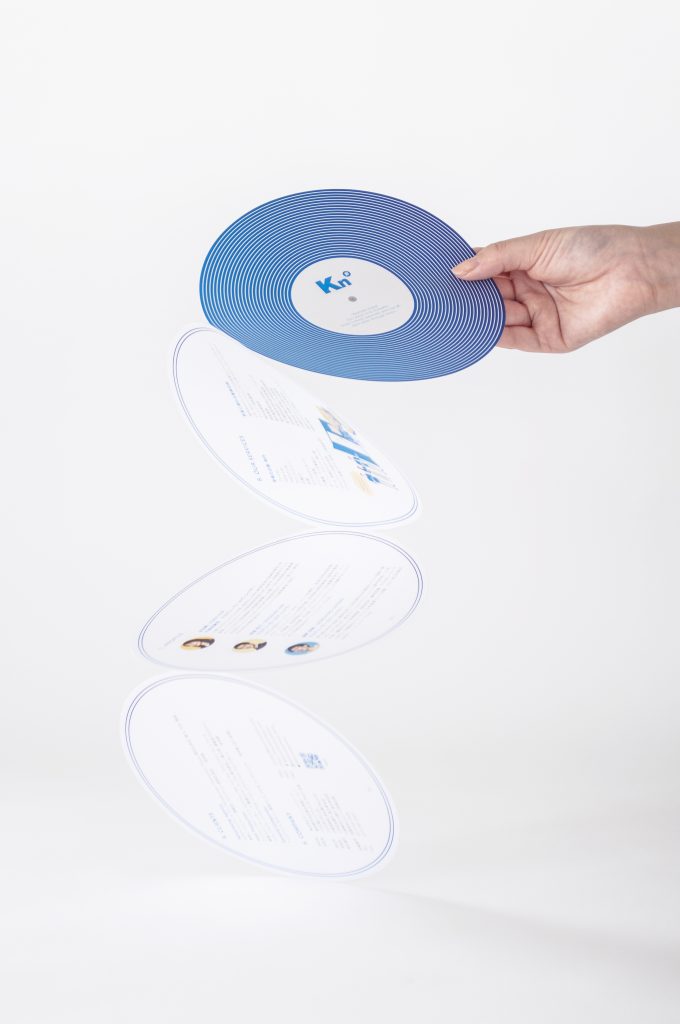 小栗 展示コンセプトがレコーディングスタジオだったので、それに合わせてレコード型のリーフレットを制作しました。展示会では多くのA4チラシをもらいますが、その中で丸いレコードの形は印象的で目を引きます。円がジャバラ状につながった形状は、時間がない方にはパッと広げて概要を、じっくり聞きたい方には1枚ずつめくって絵本のように説明できるようにしました。展示空間の印象をそのまま持ち帰っていただき、帰社後に見返したときにも記憶が蘇ります。